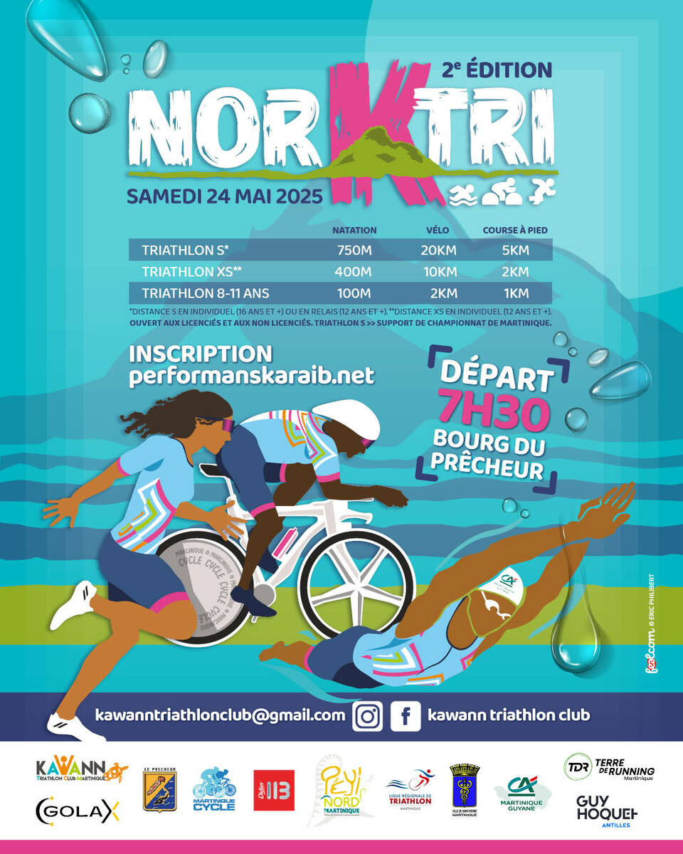 Rendez-vous le samedi 24 mai 2025 entre Le Prêcheur et Saint-Pierre pour le triathlon du Nord Caraïbe, au cœur des paysages spectaculaires entre Le Prêcheur et Saint-Pierre.