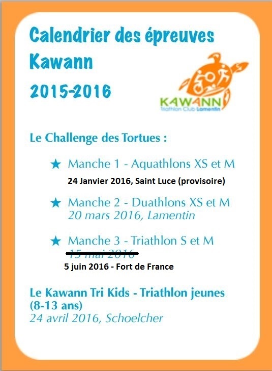 Maj du 31.12.2015: l'AQUATHLON se fera certainement à Saint Luce le 24 janvier 2015. une fois la date validée par la sous-préfecture nous vous en informerons.